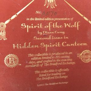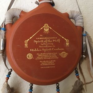 Spirit of the Wolf by Diana Casey, second issue in the Hidden Spirit Canteen Collection. 2003 The Bradford Exchange. Suede, beads and feather detailing, feathers shows a little shedding which is natural and this is 16 years old. But it’s a gorgeous piece with no chips or cracks. Easy to hang. 22” x 8”.