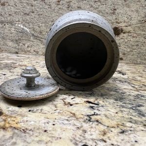 Charming pale blue glazed jar with brown specks and a perfectly fitting lid. Perfect for storage or decoration.