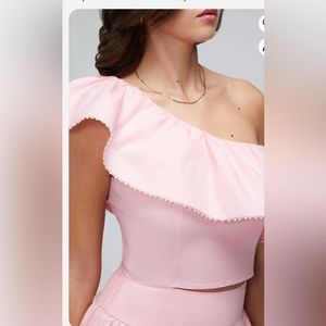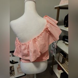 Cut from cotton poplin with a touch of stretch, the Davenay Top is a cropped, fitted silhouette with an elasticized smocked back and an asymmetrical, one-shoulder neckline, which features a wide ruffle with clear beaded trim.