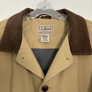 This is a Vintage LL Bean Barn Jacket in Men's size XL. Made of durable canvas material with a flannel lining, it features a spread collar, button closure, and full zip. The jacket is designed in a chore coat style with a mid-length and beige color. Suitable for casual or workwear occasions, it has a vintage look and is ideal for winter and fall seasons, perfect for activities like hunting, work, and hiking.