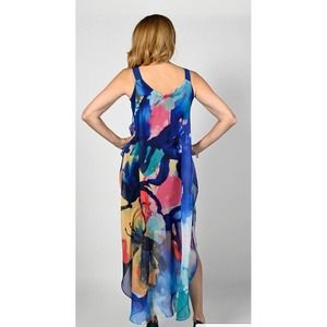 Gorgeous bold colors of blue, yellow and pink on the sheer overlay covering a stretchy blue tank dress underneath. New with tags - retail $225.00