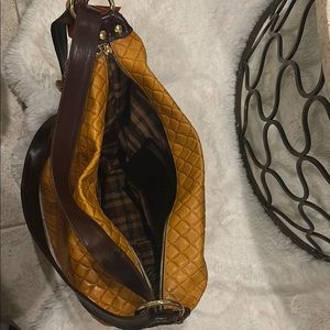 This Marino Orlandi large slingback, shoulder bag. features a striking mustard yellow color and a luxurious diamond-shaped quilted pattern. Crafted from high-quality materials, it offers a slouchy silhouette perfect for everyday use. Adjustable straps for multi-purpose, gold tone zippers and chain. Measurements height 15” width 8” and length 15”