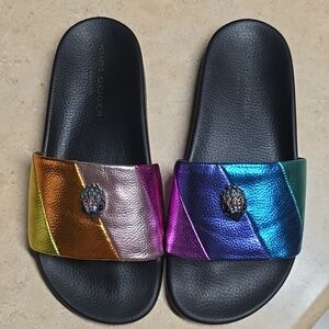 Vibrant high-top sneakers with a mix of orange, blue, black, and green. Features a sleek design with a white swoosh accent.