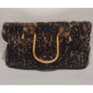 Vintage Faux Cheetah Fur Handbag With Bamboo Handles And Red Interior