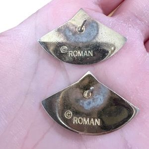 ROMAN Cobalt Blue Enamel Inlay Art Deco Style Fan Pierced Earrings. In preowned condition: wear/gold tone loss to the back of earrings. Stamped ROMAN on the back. Light and dark blue enamel inlay art deco fan pattern with a hatched background. For pierced ears.
