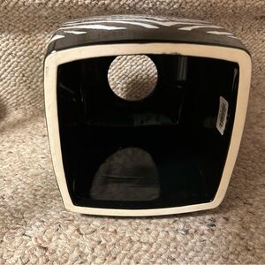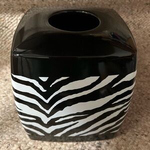 Black and white zebra design ceramic tissue box cover. Excellent for home or office. Measures 6” wide x 6 1/2” tall. New in box.