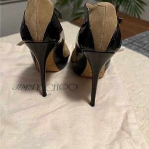 Elevate your style with these elegant Jimmy Choo heels. Featuring a chic black leather and tan suede design, these shoes are perfect for any occasion. Experience luxury and comfort with every step.