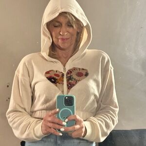 Medium black zip up hoodie with front pockets Back of the hoodie shows a Buddha in white with message on the hoodie. True to size