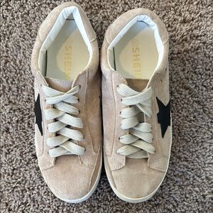 Step out in style with these chic tan sneakers featuring a bold black star. Perfect for casual outings, these shoes offer both comfort and flair.