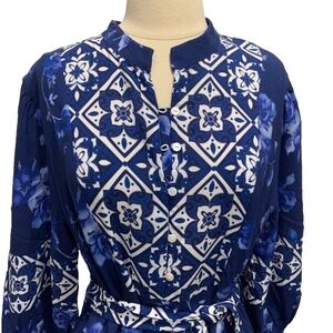 CELINA MOON BOHO BLUE PRINTED 3/4 SLEEVES BELTED MIDI DRESS SIZE L $259