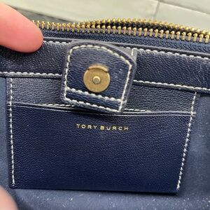 Stylish black quilted crossbody bag with gold accents. Features Tory Burch logo.