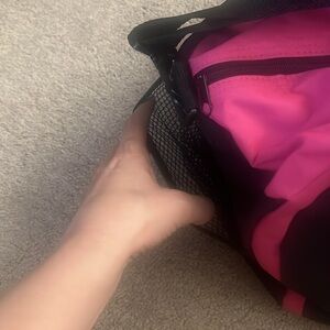 Never used I got it a gift when I was selling Mary Kay and there is a spot on the top of the duffel bag. Other than that the duffel bag is in good condition.