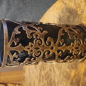 Enhance your home decor with this elegant black and gold hurricane candle holder. Its intricate design adds a touch of sophistication to any room. (Candle not included)