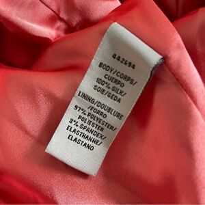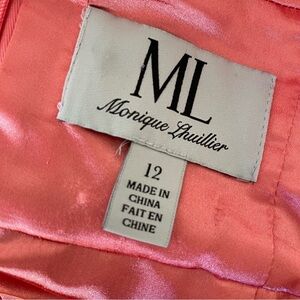Stunning new-with-tags Monique Lhuillier floral silk chiffon sleeveless midi dress, Size 12. Horizontal ruched pleating throughout. Lined. Back zip and eye & hook closure. Watercolor floral print in coral, cream, and green colorway -- perfect for Spring! 14" shoulder to shoulder laid flat, 18" armpit to armpit laid flat, 16" waist laid flat, 36" top of shoulder to bottom hem. In New condition with no noted flaws. Retail $600.