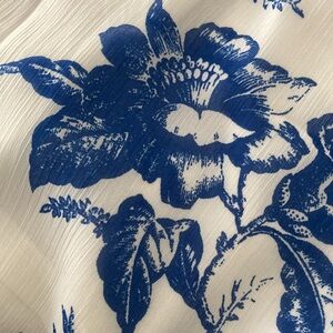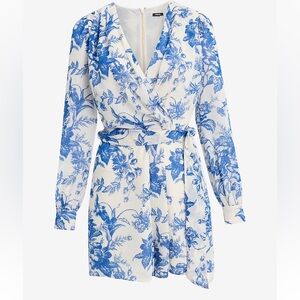 Brand new. A blue floral print covers this long sleeve romper with a flattering tie waist, wrap front, and v-neckline. This style is fully lined. Inseam: 3". Polyester. Machine wash. Comes from a pet/smoke free home.