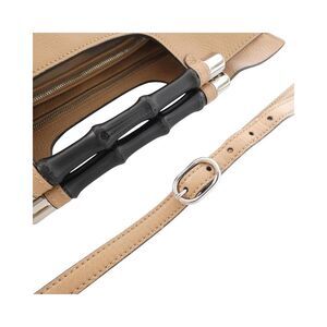 This Gucci handbag is crafted from highquality grained leather Its structured body features a unique bamboo top handle and a detachable shoulder strap offering versatility and style The beige color makes it a timeless and sophisticated accessory suitable for everyday wear or special occasions.