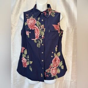 The Details: The Roxanne Snap Tank has sewn-in bust darts, a collar, metal snaps, and two breast pockets. She has a slightly curved hemline and comes in woven denim.