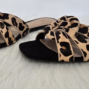 These INC International Concepts sandals feature a striking animal print design on a wide strap, offering a bold and trendy look. The black sole provides a comfortable flat profile, making them perfect for casual outings. With their modern square-toed shape, these sandals effortlessly blend style and comfort. Never worn.