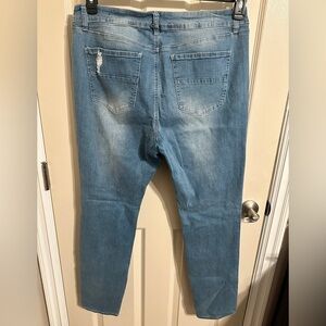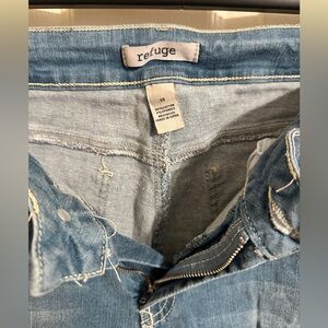 In great pre-loved condition. Elevate your style with these trendy and comfortable Refuge distressed skinny jeans in a light denim wash. These jeans feature a high-rise waist, zip/button closure, and a 5-pocket design with lots of stretch. The ripped and distressed details add a touch of edginess to your outfit, making them perfect for any occasion.