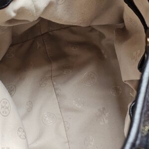 Gorgeous Tory Burch Amanda Black Pebbled Leather handbag with gold-tone accents and hardware also comes with an adjustable detachable Crossbody strap. Clean interior lined with embossed fabric and Tory Burch metallic emblem, zipper pocket and 2 slip pockets and snap top closure. Exterior is in like new condition with a front snap pocket and back slip pocket for all ur essentials. This beautiful spacious bag have metallic feet. Perfect for any occasion.
