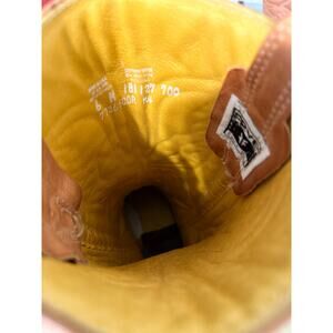 RARE! Especially in this condition, not sure if these were ever actually worn, these are from the retired white box series ( early 2000's) made in the USA from thick quality pinkish pink leather, banana yellow interior and epic cream eagle stitched detailing. They do have some signs of "age wear", slight rub off from antiqued brass hardware, some slight scuffs but overall excellent, wear with skirts, boho dresses, rolled up jeans, overalls etc. They are not made like this anymore and are getting harder and harder to find!