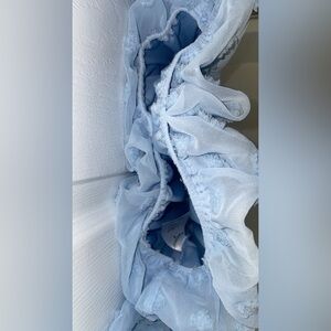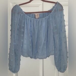 Francesca’s blue Swiss dot off-shoulder blouse. Lined bodice, sheer sleeves, elastic hem. Excellent pre-owned condition.