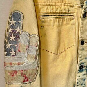This Men's size medium (very rare) blonde denim jacket offers unique style & statement with its blended wash of golden yellow and hints of blue denim accents throughout arms and body and down the center of button placket. Both sleeves feature a large starred peace sign patch ( located above the elbow) Definitely a unisex garment that could elevate & enliven any contemporary wardrobe.