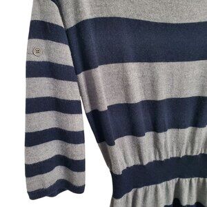 Ann Taylor LOFT brand striped sweater dress, super soft merino wool blend, featuring horizontal stripes in navy blue and gray, with an elasticized waist and 3/4 length button tab sleeves