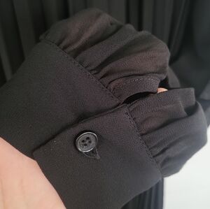 This stunning black shirt dress by Michael Kors is a versatile addition to any wardrobe. Made from polyester featuring a chiffon fabric type, this dress is lightweight and lined for added comfort. The flowy dress boasts a collared neckline, long poet sleeves, and a pullover button closure. Sleeves are unlined & semi sheer.