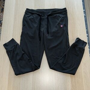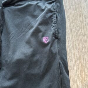 Color is black. Breast Cancer version, so logo is pink. Medium. Good used condition.