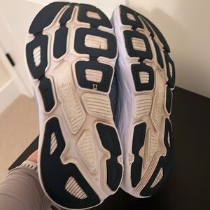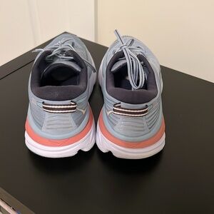 HOKA Bondi 7 size 8.5M light blue with navy and pink trim. Insoles include metatarsal pads to improve foot alignment and alleviate foot bridge pain