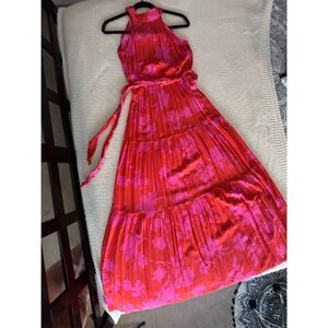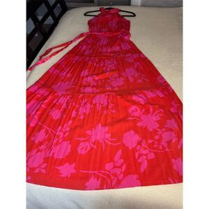 Keywords: maxi dress, halter neckline, summer dress, vacation attire, floral pattern, sleeveless, casual wear, multicolor, women's fashion, flowy dress, matching belt, machine washable, woven fabric, summer style, pre-owned.