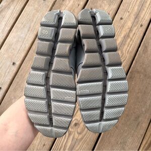 On Running Cloud X3 in Mist / Rock. Size 11. Please know your sizing in this brand. Shows normal signs of wear, nothing too noticeable. Color is a gray color scheme. Speed. Intensity. Focus. They don't come easy. But they're easier when your shoes are as light and responsive as it gets. The Cloud X 3 pushes new limits in terms of weight, agility, and versatility. So you can react, respond, and crush every workout, and every run.