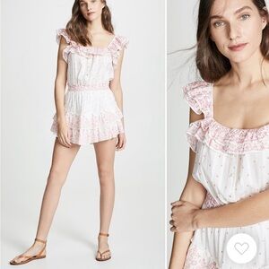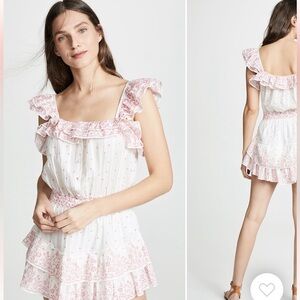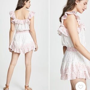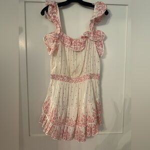 LoveShackFancy mini dress - excellent condition. Charming sleeveless dress with floral patterns. Features a white base with pink accents. Perfect for a casual outing.