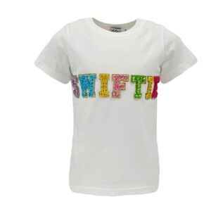 This chic embellished white tee is adorned with the word "SWIFTIE" in a spectrum of sparkling crystals, perfect for showing off their fun and vibrant personality.