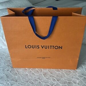 This authentic Louis Vuitton empty gift/shopping bag is 13.5” x16 X 6”. It has blue grosgrain handles. This bag is new and in good condition