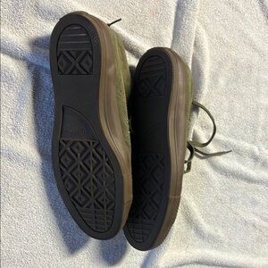 These Converse sneakers feature a striking green color, crafted from durable canvas material. The high-top design offers both style and support, while the flat brown rubber sole ensures comfort and traction for everyday wear.