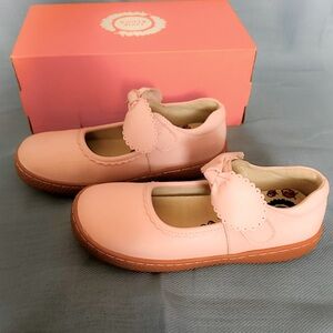 These charming pink dress shoes feature a classic Mary Jane style with a rounded toe and a single strap across the top. Made from a smooth material, they are designed for comfort and style, perfect for special occasions. Size 1 fits to 1.5. Darken insole from wear. No stains or tears in great condition.