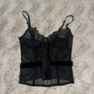 This elegant black camisole from Victoria's Secret features a fitted bustier style with a delicate lace overlay. The sleeveless design and structured waistline enhance its sophisticated silhouette, making it a perfect choice for a romantic evening.💖🫶