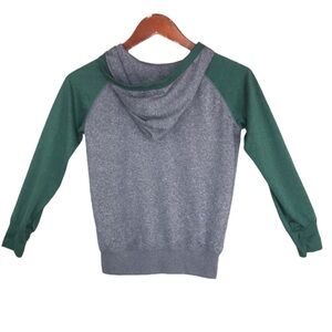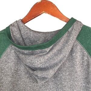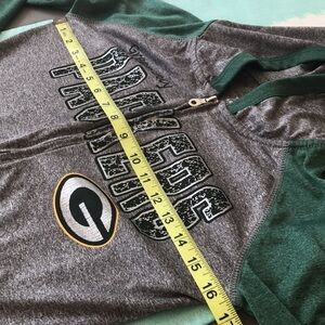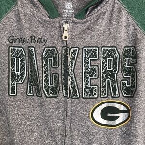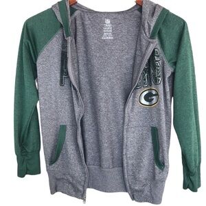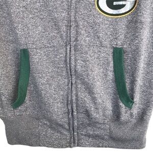 NFL Team Apparel, Green Bay Packers Football, Light Weight, Hooded Jacket. Full front zip closure. Two front pocket that when jacket is zipped looks like a kangaroo pocket. Gray with green sleeves. Green Bay Packers front graphic. Size large 10/12. See photos for measurements to ensure fit.