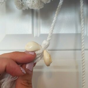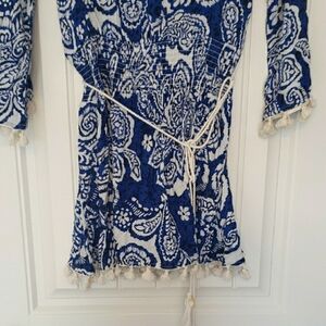 Stylish blue and white paisley dress with 3/4 sleeves. Features a tie waist and fringe details. The waist belt has 4 shells on it, one is damaged.
