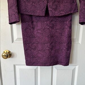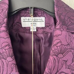 Elegant purple blazer and skirt set by Sharagano. Features a floral pattern. Perfect for professional settings.