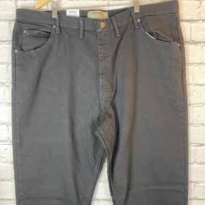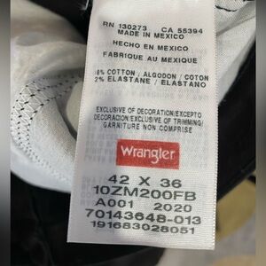 Get ready to ride the range in style with these Wrangler Authentics black straight leg jeans. Made from comfortable cotton denim with a solid pattern and dark wash, these jeans feature a relaxed fit and 5-pocket design with button and zipper closures. Perfect for any cowboy or 90s enthusiast, these jeans are easy to care for and have a waist size of 42 inches and an inseam of 36 inches. The jeans are also machine washable, making them easy to maintain. Wrangler, a trusted brand in men's clothing, ensures that these jeans are of the highest quality and will last for years to come.