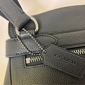 Black leather Coach laptop bag with gunmetal hardware. Will easily fit a 15" laptop. Black pebble leather with 2 inside side pockets under flap, 2 additional pockets (see pics) along with an area for laptop with tab closure, a large a zip compartment inside and a zipper compartment on the back. Has a leather handle and a study nylon adjustable strap with gunmetal hardware. Barley used. No stains or blemishes on leather. No tags but original care card included.