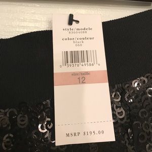 Black skirt fully embellished with gorgeous sequins. Cynthia Steffe, new with tags, size 12. Sits at waist and hits above knee. Straight cut and straight hem. Fully lined with hook and zip closure. MSRP $195.