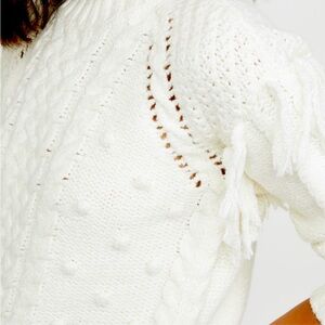 Stay cozy and stylish with this elegant ivory cable knit sweater. Perfect for any occasion.