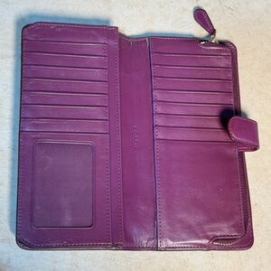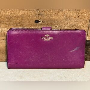 Coach purple leather wallet. Gold Coach logo on the front. Button closure opens to multiple credit card slots, and ID window, and cash slots. Zippered coin pocket. In pre-owned condition with a mark on the front and cracking in the leather inside on the end. Price reflects the condition, with a lot of life still left! 8"x4.5"