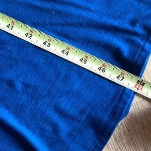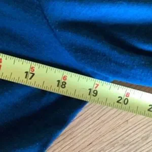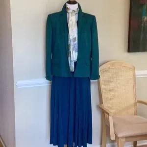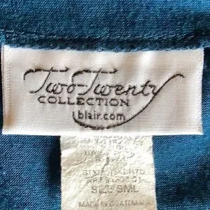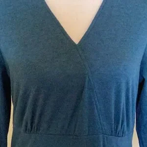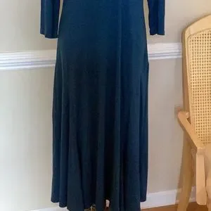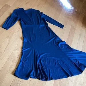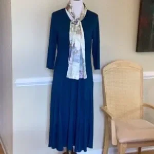 Two-Twenty by Blair deep blue poly rayon spandex blend easy care midi dress. Faux surplice neckline, empire waist, 3/4 sleeve, full gored swing skirt. Size SML. Lots of stretch. See measurements.