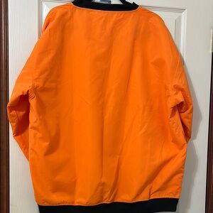 Eye-catching orange pullover with a prominent white 'T' logo. Features black accents on the V-neck and sides.