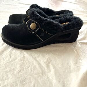 Stylish black suede clogs with faux fur lining. Perfect for casual wear. Had sole stickers. Brand new. Been stored. See photos. Lining is like shearling. Adorable